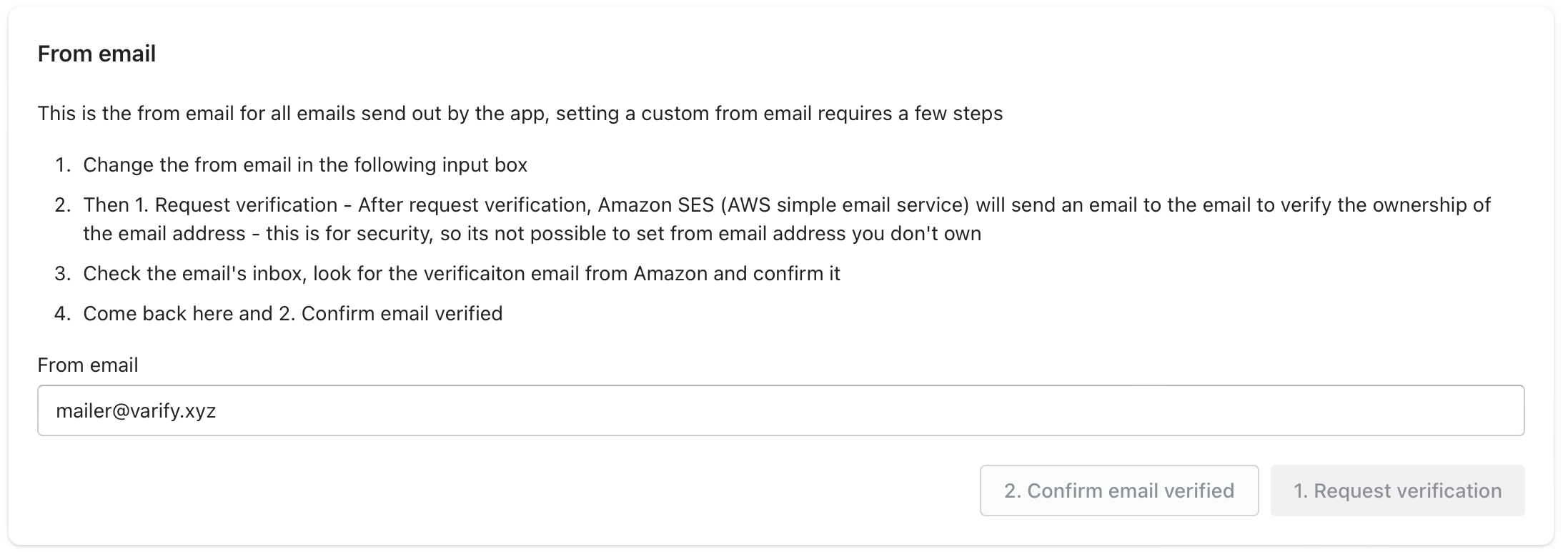 The app use Amazon Email service to send out emails, because the problem with spams and identity, all from emails will need to verify to confirm the real identity and ownership.