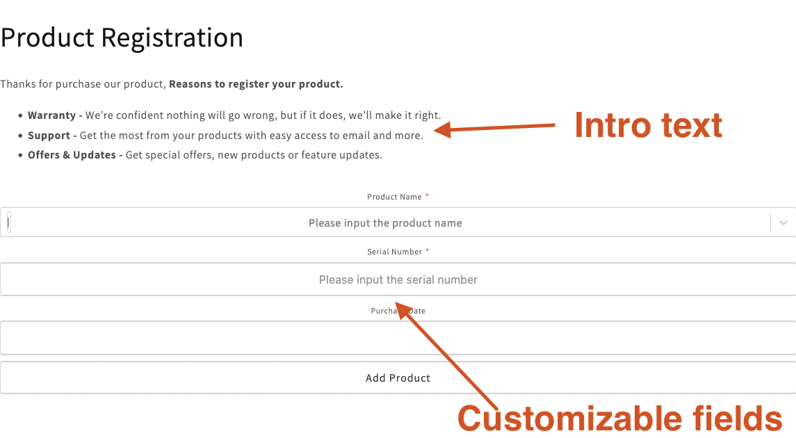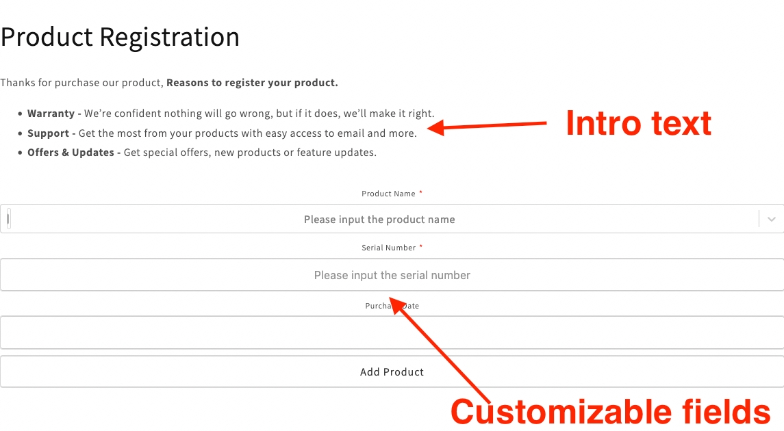 The is the introduction text that list the benefit of product registration or any information you want customer to see - by default the app generated a generic text for it, but it can be change in the App admin > Forms > Form's settings.