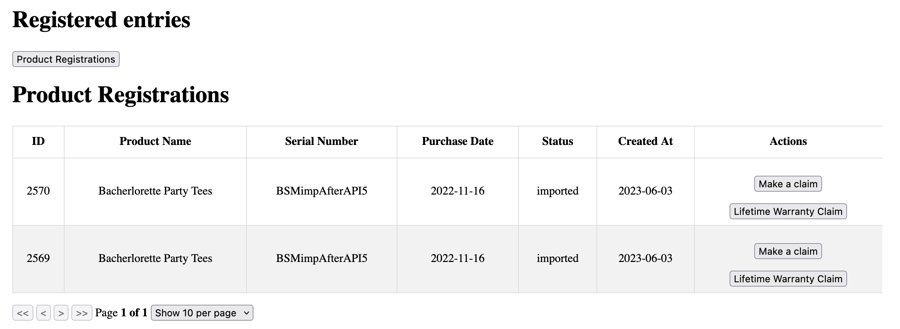 Show registered entries like product registrations or claims